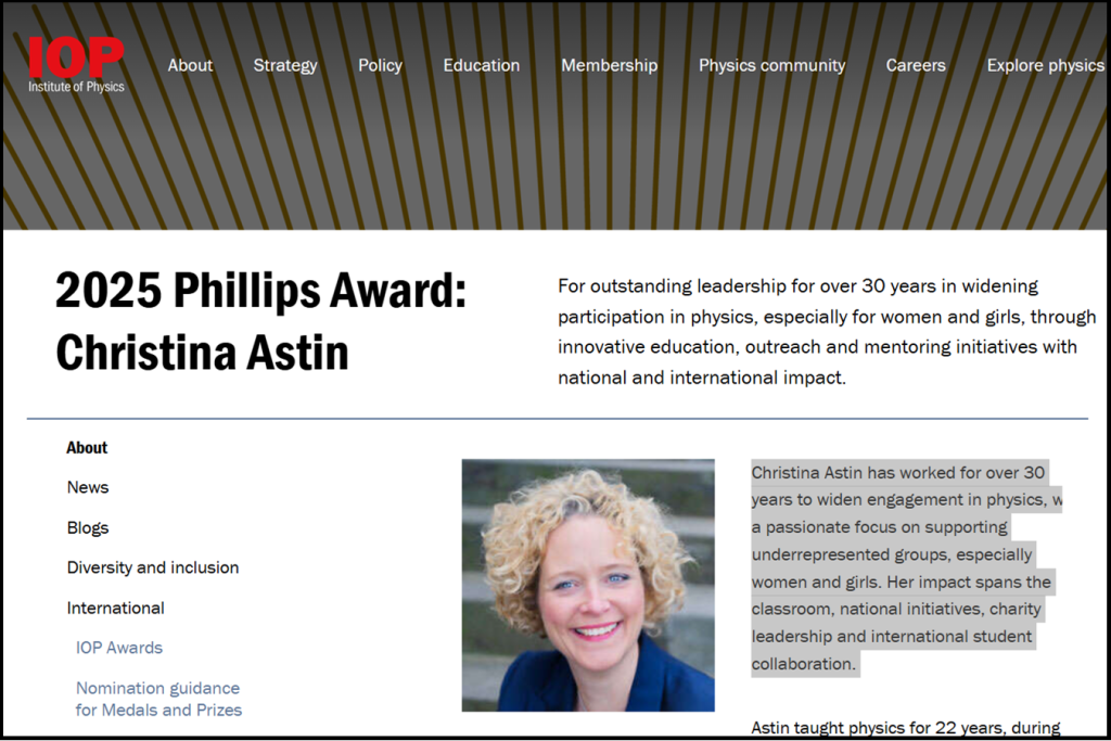 You can learn more about the award and why Christina has rightly been recognised in this way at the Institute of Physics website at https://www.iop.org/about/awards/2025-phillips-award-christina-astin.